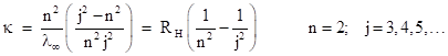 Three of these are divisible by 23, three are divisible by 5, three are divisible by 7, and two are divisible by 33. Thus we can easily express these numbers as simple fractional multiples of 840 = 23×3×5×7, which corresponds to the series limit λ∞ = 3645.6 A. It may have been just this kind of numerical experimentation that led Balmer to recognize that the four prominent wavelengths are given very closely by (9/5)λ∞, (16/12)λ∞, (25/21)λ∞, and (36/32)λ∞. He also noticed that the numerators of the coefficients are consecutive squares, and each denominator is 4 less than the numerator. He speculated that the pattern would continue up to the series limit, which is indeed the case. In terms of the wave number κ (=1/λ), Balmer's formula can be written as |