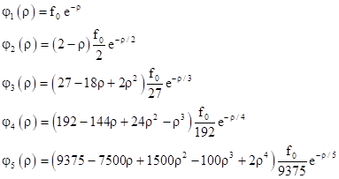 and we can substitute 1/(na0) for C in the preceding wave functions and clear fractions. In terms of the normalized radius parameter ρ = r/a0 the wave functions are |