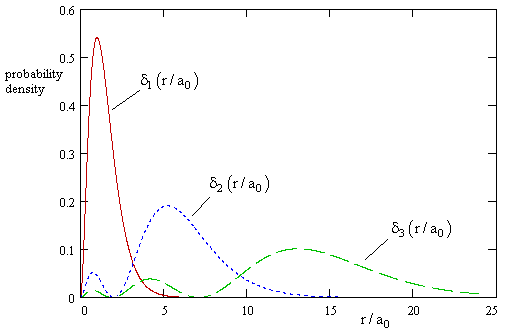 Of course, in accord with our choice of nomalizing factors, the probability density for finding the electron in an incremental shell of radius r is δn(r) = 4πr2φn(r)2. This is plotted in the figure below for the first few values of n. |