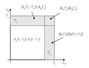 One common way of modeling such a system is by means of a fault tree, but we can’t use a simple AND gate with the two components, each with 1000 hour exposure times, because this wouldn’t account for the 200 hour limitation on the combined state. The usual approach when we have two components with long individual exposure times TL and a short exposure time TS for the combined state is to consider the region of the time-time space in which the possible times tA,tB of failure for the two components are depicted as shown in the figure below. Here we make use of the rare event approximation, so the probability density is essentially constant over this square region. |