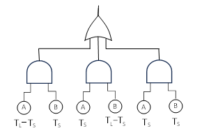 The probability of the dual fault condition being present on the last flight is equal to the probability of the dual-fault condition arising during the last short interval of duration TS, which can be shown by adding up the probabilities for the flights during that last short interval, after the last dual-fault check/repair that occurs at TL – TS. Thus, the probability is proportional to the shaded region in the above figure. These three terms can be represented as branches of a fault tree, with the exposure times as shown below: |