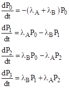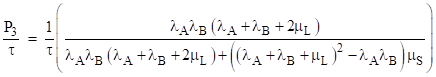 For a very simple example, consider a system consisting of two components, designated as A and B, with constant failure rates λA and λB, each checked and (if necessary) repaired every 1000 hours, but suppose in addition that an alert is generated if both components are failed, and the system is checked for this alert and (if necessary) repaired back to the full-up state every 200 hours. What is the normalized average probability of the dual-fault condition? |