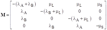 As noted, several approximations were used in arriving at this result. For a more rigorous approach, we can represent the system by a Markov model as shown below. |