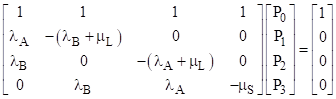 To find the steady-state solution, we need to note that the transition matrix has zero determinant, and hence has no inverse, because the rows identically sum to zero, so they are not independent, i.e., given any three of the rows, the fourth is fully determined. So, to solve for the steady-state solution, we need to replace one of the rows (typically the first, for convenience) with some independent condition, namely the conservation identity |